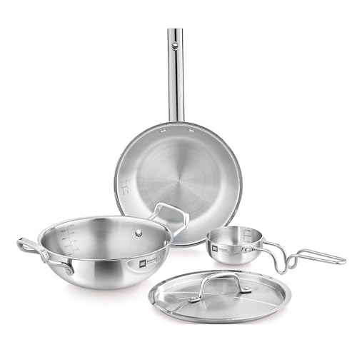 Bergner TriPro Tri-Ply Stainless Steel 4 Pcs Cookware Set - 22cm Indian Wok/Kadai with Lid, 22cm Frypan, 10cm Tadka Pan, Even Heating, Less Oil Use, Healthy Cooking - Induction and Gas Stove Ready